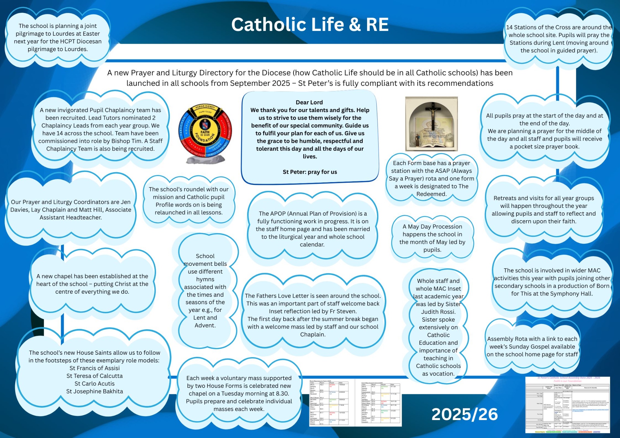 At St Peter's Catholic School, we are driven by a profound and unwavering faith. We aim to be so bold and explicit about our beliefs that grace envelops and sustains us in our mission, which is 'Faith is our Foundation'. Jesus said to our Patron, St Peter, “on this Rock I Build my Church”, Our heartfelt aspiration is to play a meaningful role in building God's kingdom, reflecting our deep commitment to our faith in every aspect of our school community. We believe that by embracing and living out our faith with courage and conviction, we can inspire and nurture the spiritual growth of our pupils, staff, and the entire school community, making them Missionary Disciples. Together, we strive to create a nurturing environment where God's love and grace are at the heart of everything we do.